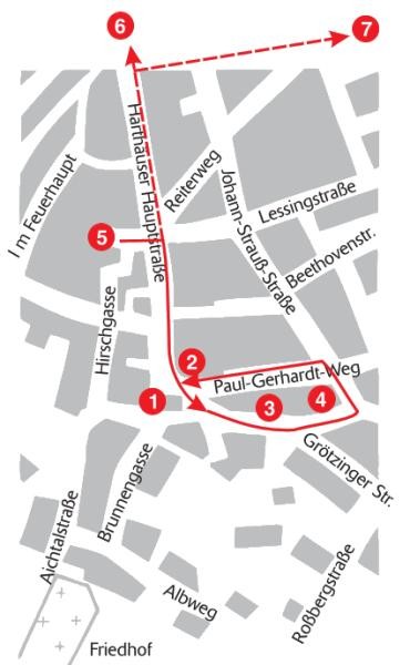 Grötzinger Str. 13. Hier stand das erste eigene Schulhaus von Harthausen, erbaut 1805. Das Schulhaus umfasste nur ein Klassenzimmer. 1843 wurde es an Privat verkauft und 1934 durch Blitzschlag zerstört. Das heutige Gebäude stammt von 1935.