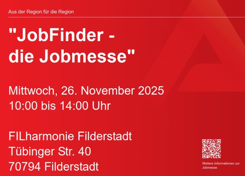 Am Mittwoch, 26. November 2025, findet von 10:00 bis 14:00 Uhr in der FILharmonie Filderstadt die „JobFinder – die Jobmesse 25“ statt. Die Veranstaltung bietet Unternehmen aus Filderstadt und Umgebung eine hervorragende Gelegenheit, mit qualifizierten Fachkräften und interessierten Arbeitssuchenden ins Gespräch zu kommen. Erwartet werden rund 800 Besucher*innen. Die Teilnahme als Aussteller ist kostenfrei.