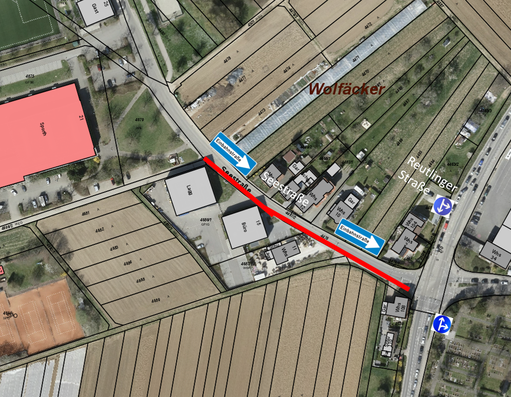 Einbahnstraßenregelung in der Seestraße, zwischen Gebäude 15 und der Reutlinger Straße, aufgrund von Arbeiten zum Glasfaserausbau.