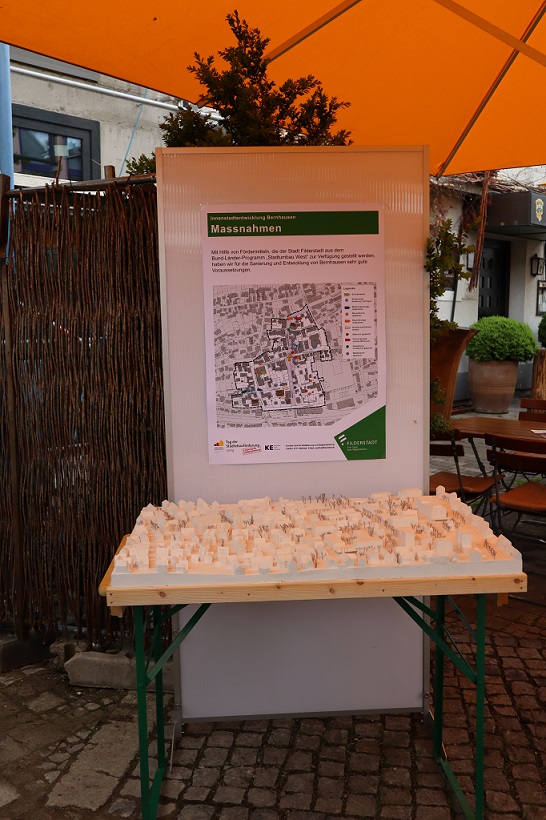 Ein Programmpunkt war die Vorstellung des städtebaulichen Rahmenplans, der zeigte wie die Bernhäuser Innenstadt in 30 Jahren aussehen könnte. Für Fragen rund um die Rahmenplanung stand das Amt für Stadtplanung und Stadtentwicklung zur Verfügung.Frau Schütz von der LBBW Immobilien Kommunalentwicklung GmbH gab unter dem Motto „Was passiert im Gebiet?“ einen Überblick über die Sanierungsmaßnahme „Innenstadt Bernhausen“ und stellte Fördermöglichkeiten Privater sowie die Vorgehensweise in der Beratung vor.Der Architekt der Baumaßnahme zur Erweiterung des Schwanen-Bräu ermöglichte einen Einblick in die laufende Baumaßnahme. Das Bauvorhaben soll bis Ende September 2019 fertiggestellt sein und wird aus Zuschüssen der Städtebauförderung unterstützt. Im Anschluss wurde eine Führung durch den Rohbau Bernhäuser Hauptstraße 36 bis 40 angeboten, um das Bauvorhaben aus nächster Nähe zu erkunden. Anhand von Plänen und Zeichnungen wurden in der begleitenden Ausstellung die Themen des Objektes gezeigt.