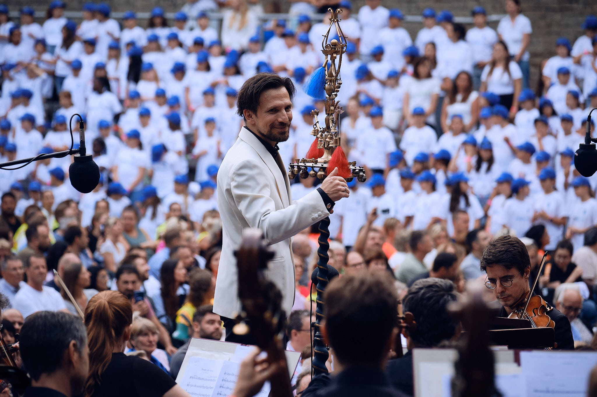 Kleine „Leute“ ganz groß … Gegen 20 Uhr war es auf der Freilichtbühne so weit: SingGrund „meets“ Staatsorchester. Rund 750 Filderstädter Mädchen und Jungs mit weißen T-Shirts und blauen Mützen erhoben sich von ihren Plätzen. Gleichzeitig nahmen die hochkarätigen Profi-Musiker*innen – alle klassisch in Schwarz gekleidet – auf der Bühne Platz. Dann ging alles ganz schnell: Blickkontakt zwischen Monika Grauschopf und Cornelius Meister, eine Handbewegung des Dirigenten und die Musik setzte ein – dieses Mal nicht mit den bekannten Kinder-Ohrwürmern aus dem SingGrund-Repertoire. Nein. Mozart („Eine kleine Nachtmusik“, „Marcia alla turca“) und Beethoven („Freude schöner Götterfunken“) standen auf den Notenblättern. Kurz darauf ertönten die Kinderstimmen.