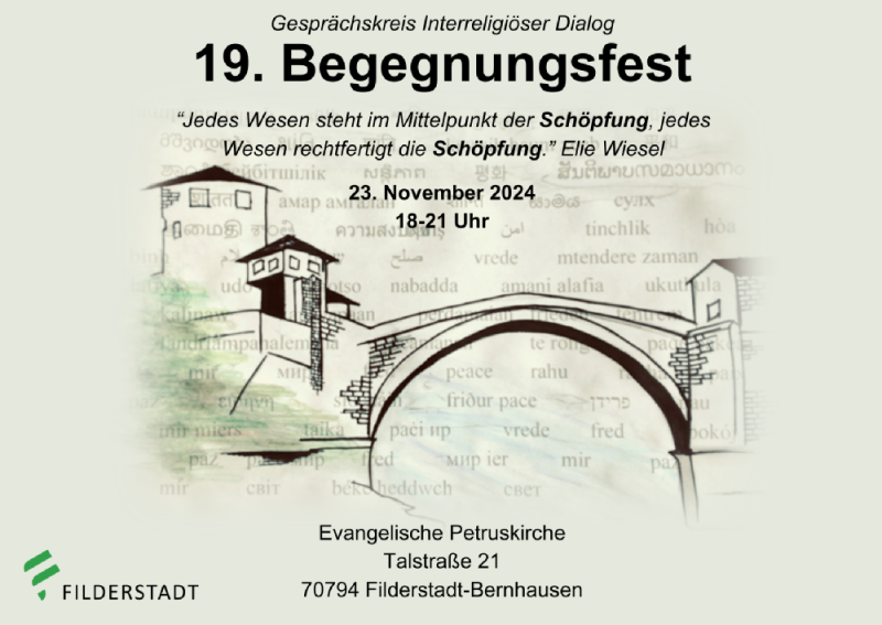 Am Samstag, den 23. November 2024, lädt der Gesprächskreis Interreligiöser Dialog herzlich zum 19. Interreligiösen Begegnungsfest ein. Die Veranstaltung findet von 18 bis 21 Uhr in der evangelischen Petruskirche, Talstraße 21, in Filderstadt-Bernhausen statt.