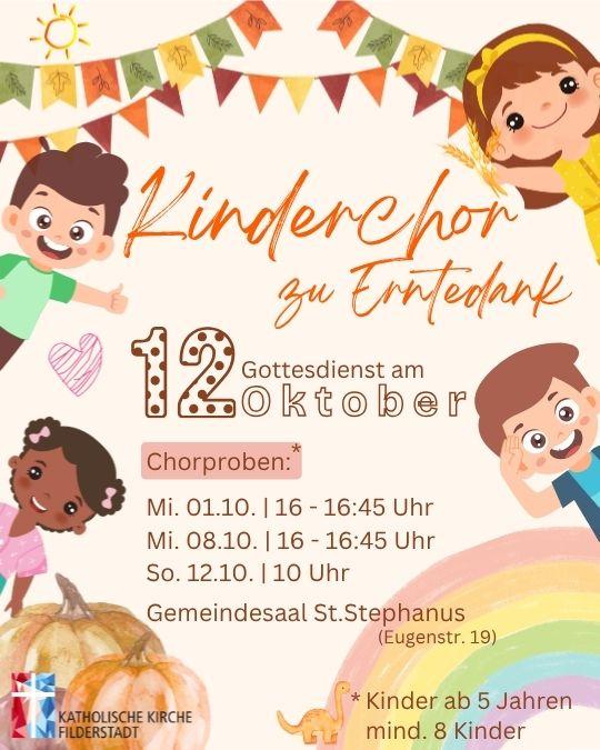 Der Gottesdienst zu Erntedank wird dieses Jahr in der Kirche St.Stephanus am 12. Oktober um 10.30 Uhr gefeiert. Dazu soll ein Projekt-Kinderchor zur musikalischen Gestaltung beitragen. Die Proben finden am 1. Oktober und 8. Oktober jeweils um 16 Uhr im Gemeindesaal der St.Stephanus Kirche (Eugenstraße 19) statt.