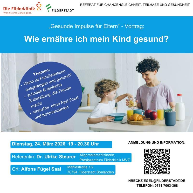 Am 24. März 2026 lädt die Stadt Filderstadt von 19 bis 20.30 Uhr zu einem informativen und praxisnahen Abend in den Alfons-Fügel-Saal in Bonlanden (Mahlestraße 16) ein. Im Mittelpunkt steht eine Frage, die viele Familien beschäftigt: Wie gelingt eine gesunde, ausgewogene und alltagstaugliche Ernährung für Kinder – ohne Fast Food und ohne Kalorien zählen?