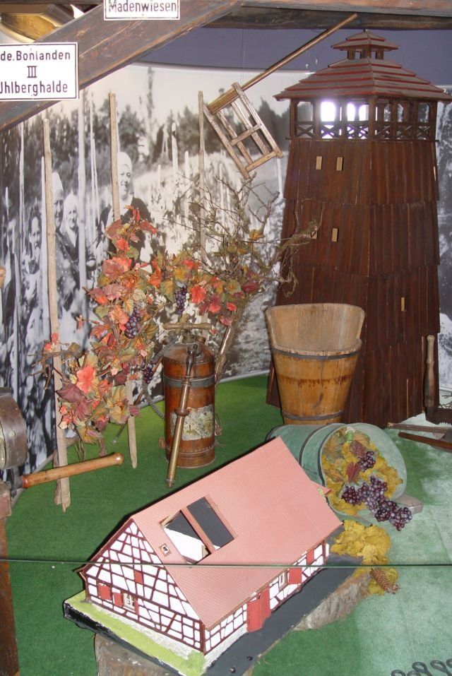 Weinbau in Bonlanden, im Vordergrund ein Modell der Kelter, im Hintergrund der alte Uhlbergturm.