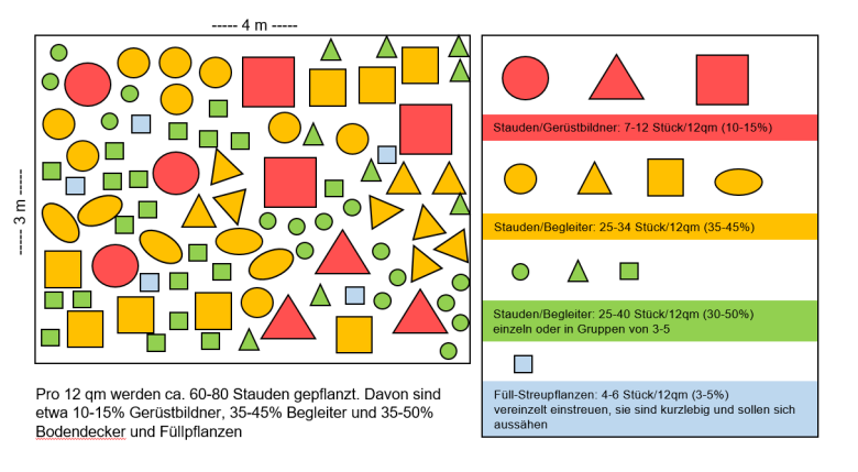 Mit der Pflanzung soll eine gleichmäßige Bedeckung des Bodens erzielt werden. Als Faustregel gilt: sechs bis neun Pflanzen können pro Quadratmeter Pflanzfläche gesetzt werden. Um eine Höhenstaffelung zu erreichen, werden robuste, höhere Stauden - sogenannte Gerüstbildner - (circa zehn bis 15 Prozent) mit etwas niedrigeren Begleitstauden (circa 35 bis 45 Prozent) kombiniert. Die Begleitstauden folgen einem Farbthema und blühen zu unterschiedlichen Jahreszeiten. Um den Boden zu bedecken und die Pflanzung noch attraktiver zu machen, werden die noch offenen Flächen mit Bodendeckern (circa 30 bis 50 Prozent) und Füllpflanzen (circa sieben Prozent) bepflanzt. Die Anzahl der unterschiedlichen Pflanzenarten sollte bei den Gerüstbildnern fünf Arten, bei den Begleitstauden acht Arten, bei den Bodendeckern vier Arten und bei den Füllpflanzen zwei Arten nicht wesentlich übersteigen. Die Gewichtung der einzelnen Arten muss nicht gleichmäßig sein. Es können einzelne Arten in höherer Stückzahl als andere verwendet werden. Das Pflanzschema rechts gibt eine Anregung, wie die Pflanzen auf einer circa zwölf Quadratmeter großen Fläche angeordnet werden können.