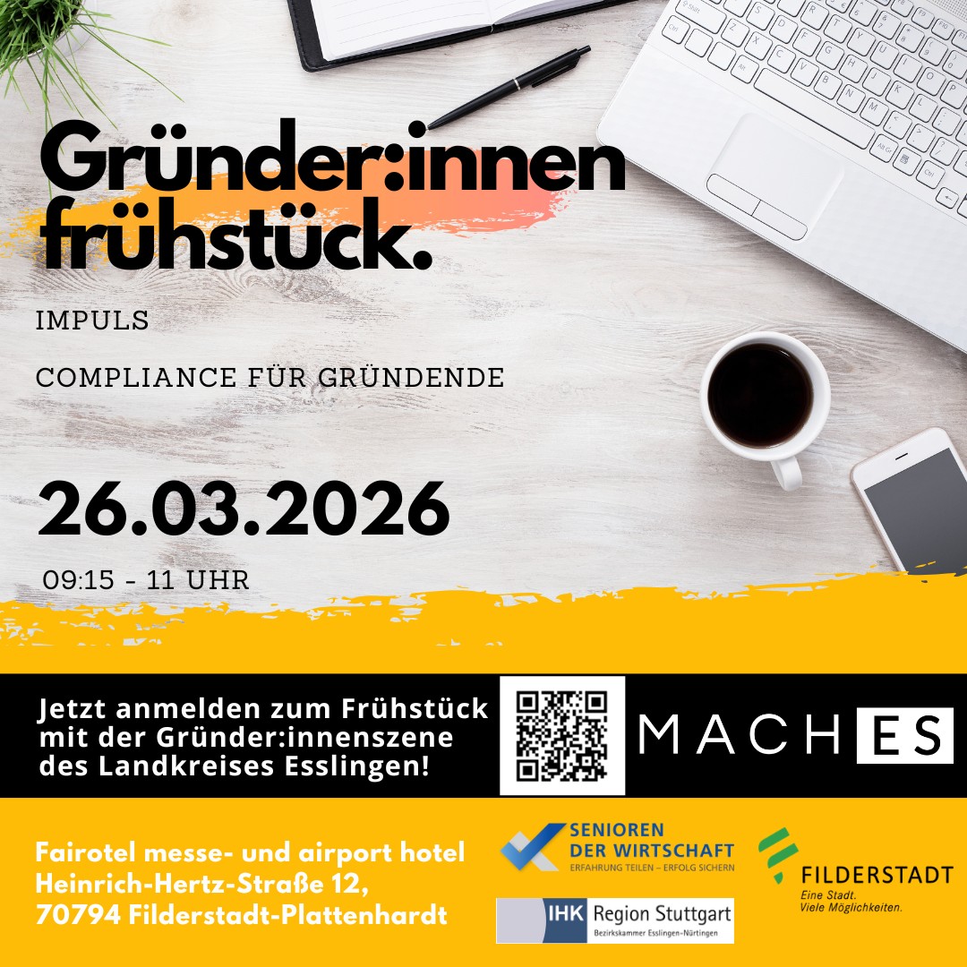 FILDERSTADT. Am Donnerstag, 26. März 2026, findet im Rahmen des MachES-Netzwerks das nächste Gründer:innenfrühstück im Landkreis Esslingen statt. Wir laden Sie herzlich in das Fairotel messe & airport hotel, Heinrich-Hertz-Straße 12, 70794 Filderstadt-Plattenhardt ein – eine perfekte Gelegenheit, sich in entspannter Atmosphäre mit anderen Gründer:innen aus dem Landkreis Esslingen auszutauschen. Das Format richtet sich an alle, die bereits ein Unternehmen gegründet haben oder kurz vor der Gründung stehen.