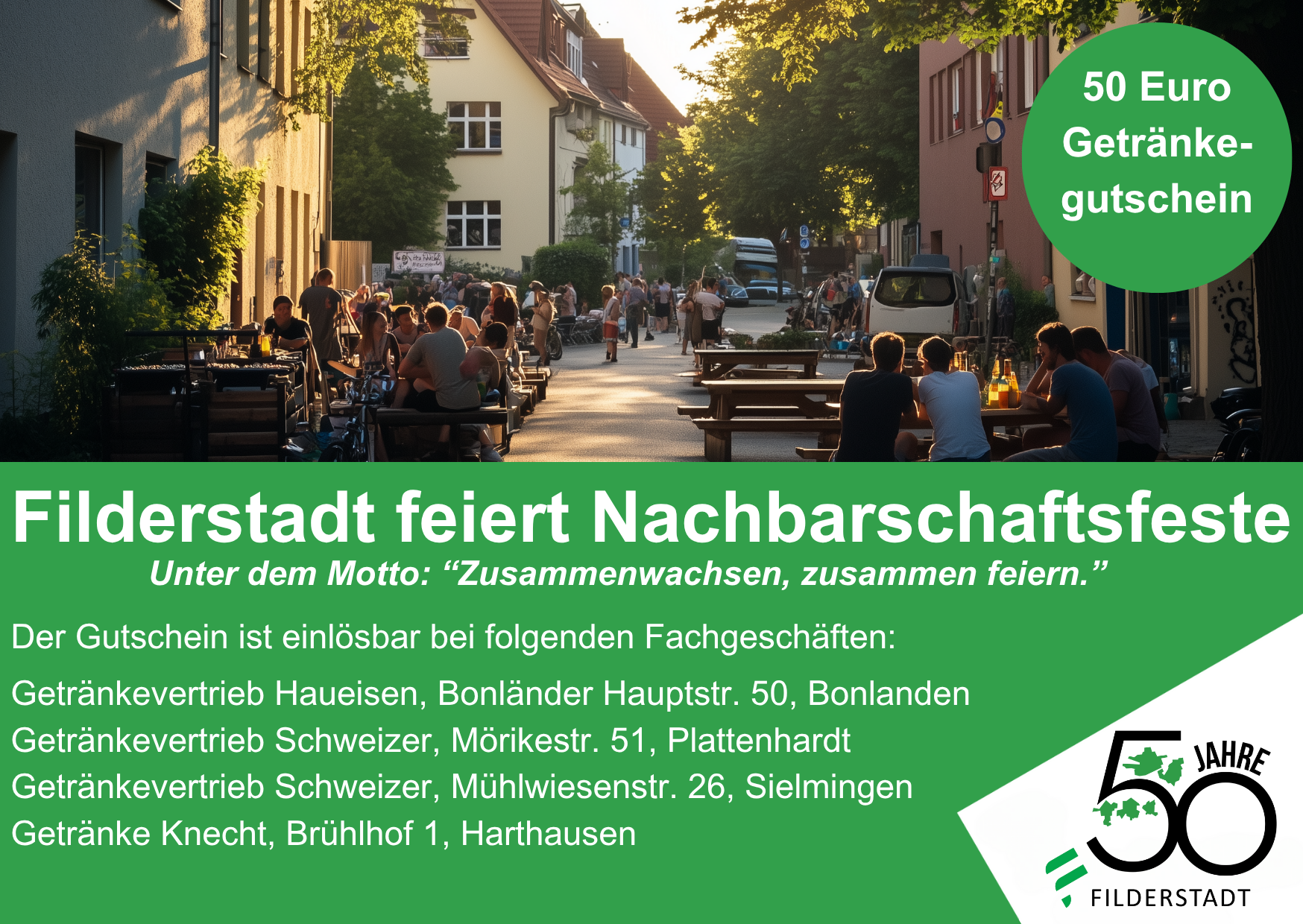 FILDERSTADT. Unter dem Motto „Zusammenwachsen, zusammen feiern.“ finden Nachbarschaftsfeste in Filderstadt statt. Alle Bürger*innen können mitmachen. Die Aktion soll das Miteinander unterstützen, fördern und stärken. Die Stadt Filderstadt spendiert anlässlich ihres 50. Geburtstages allen Hocketse-Freund*innen einen Getränkegutschein in Höhe von 50 Euro (insgesamt werden 200 Gutscheine vergeben).