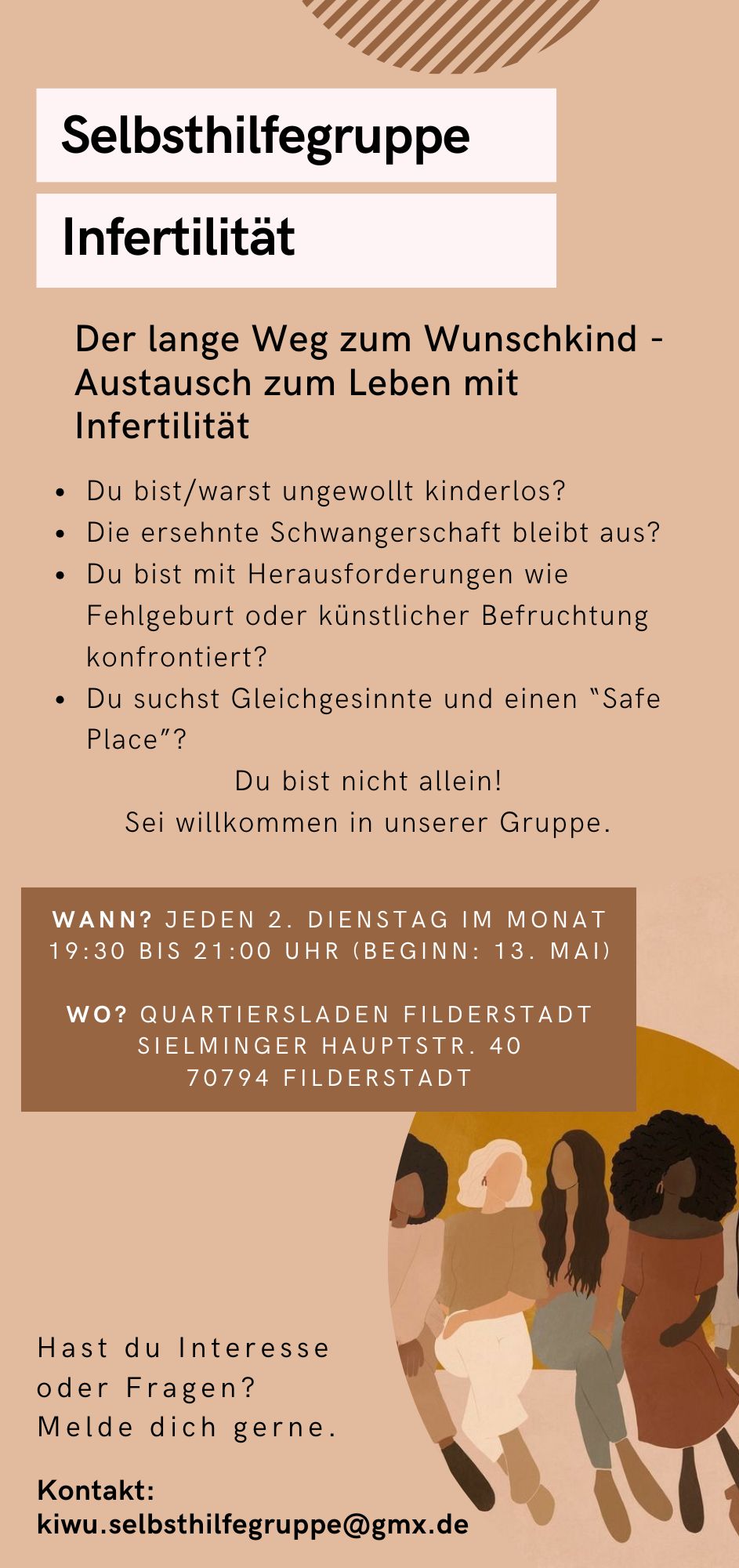 FILDERSTADT. Im Quartiersladen Sielmingen (Sielminger Hauptstraße 40) gibt es ein neues Angebot: eine Selbsthilfegruppe bei Infertilität (Unfruchtbarkeit). Vor Ort können sich Betroffene austauschen, ihre Erfahrungen und Gefühle mitteilen sowie voneinander lernen, mit der Situation besser umzugehen.