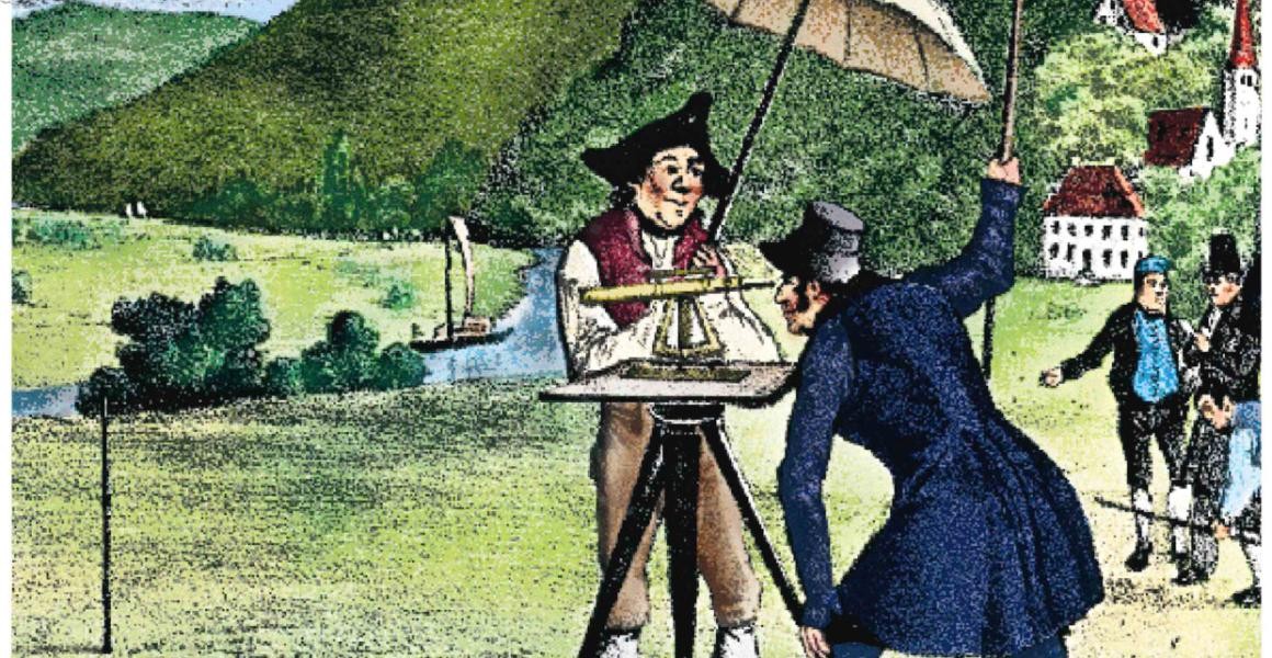 Gezeigt werden frühe Messmethoden, wie die Dreiecksvermessung oder die Vermessung von Parzellen.